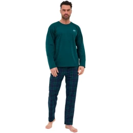 Pánske pyžamo Cornette je tradičná súprava pyžama s dlhými rukávmi a dlhými nohavicami, ktorá je určená na pohodlný nočný odpočinok. Je vyrobená z kvalitnej 100 % bavlny, ktorá zaručuje pohodlie, mäkkosť a dobrú priedušnosť. Vrchný diel má okrúhly výstrih a jemnú potlač na hrudi v minimalistickom a mužnom štýle. Spodný diel tvoria kárované nohavice s elastickým pásom podšitým bavlnou, ktoré poskytujú pohodlné nosenie.