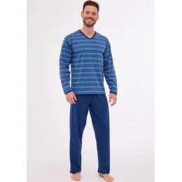 Pohodlné pánske pyžamo s dlhými rukávmi a dlhými nohavicami. Vrchný diel pyžama je vyrobený z mäkkého materiálu s horizontálnymi pruhmi a má výstrih do V, zakončený jemným lemovaním. Súčasťou súpravy sú dlhé hladké nohavice z kvalitnej bavlny v tmavomodrej farbe. Voľný strih pyžama zaručuje maximálne pohodlie a voľnosť pohybu počas spánku. Materiálové zloženie: tričko - 78 % bavlna 22 % polyester, nohavice - 100 % bavlna.