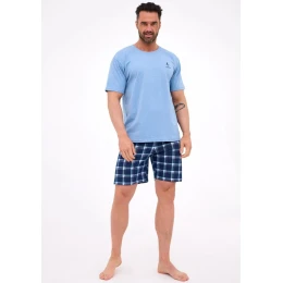 Moderné pánske pyžamo značky Cornette pozostáva z trička s krátkym rukávom a šortiek. Tričko má okrúhly výstrih a jemnú potlač na hrudi. Šortky majú károvaný vzor a elastický pás s bavlnenou podšívkou.