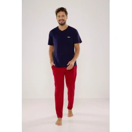 Pyžamová blúzka má krátke rukávy, výstrih do V a je zdobená vreckom. Komplet dopĺňajú dlhé jednofarebné nohavice.