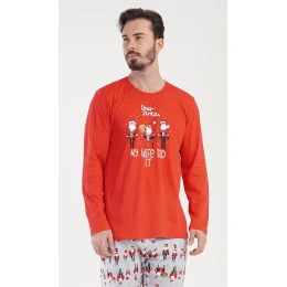 Pánske bavlnené pyžamo dlhé Santa. Pánske pyžamo sa skladá z trička s dlhým rukávom a dlhých nohavíc. Jednofarebné tričko zdobí nápis a obrázok troch Santov. Na nohaviciach sa tento motív opakuje tiež. Nohavice majú v páse gumu, šnúrku na stiahnutie a praktické vrecká. Použitý materiál je jemný a poddajný na dotyk. Podiel bavlny pri tričkách a nohaviciach je 100%.