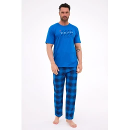 Pánske pyžamo MARATHON 3 je pohodlná súprava z prírodnej, 100 % bavlny, ideálna pre mužov, ktorí ocenia jednoduchosť a kvalitu. Tričko s krátkymi rukávmi a polkruhovým výstrihom má na hrudi modernú farebnú potlač, ktorá dodáva celej súprave športový charakter. Dlhé nohavice s módnym károvaným vzorom majú elastický pás podšitý bavlnenou tkaninou, ktorá poskytuje pohodlie bez odierania. Sú ideálnym pyžamom na večerné spanie a relaxáciu doma.