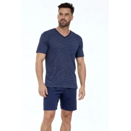 Pánske pyžamo KR 330 W/26 je klasickou a pohodlnou voľbou na teplejšie noci, ktorá spája nadčasový štýl s vysokou úrovňou pohodlia. Módne pruhované tričko s krátkymi rukávmi a špicatým výstrihom dodáva celému kúsku elegantný, mužný charakter a zaručuje voľnosť pohybu. Bavlnený úplet s prímesou polyesteru je mäkký, príjemný na pokožku a odolnejší voči deformácii.