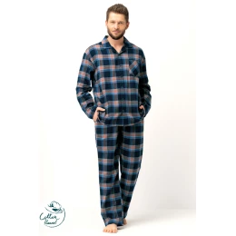 Pánsky pyžamový komplet MNS 431 je klasický komplet z mäkkého, priedušného bavlneného flanelu, ktorý je ideálny na chladnejšie noci. Košeľa na gombíky s golierom a praktickým náprsným vreckom a voľné nohavice s elastickým pásom zaručujú voľnosť pohybu a pohodlie. Módny, nadčasový vzor v námorníckej kocke s akcentmi v odtieňoch hnedej farby mu dodáva elegantný charakter. Ideálna voľba pre mužov, ktorí ocenia klasický štýl a domáce pohodlie.