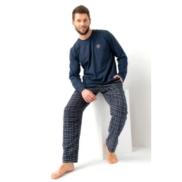 Štýlové pánske pyžamo, ktoré spája pohodlie s klasickým dizajnom. Tmavomodrá mikina s dlhými rukávmi a jemnou potlačou na hrudi vás počas spánku udrží v teple a pohodlí. Jemné kockované nohavice v tmavomodrej, tmavomodrej a červenej farbe sú vyrobené z mäkkého bavlneného flanelu, ktorý je jemný na dotyk a ideálny na chladnejšie ročné obdobie. Voľný strih a elastický pás zaručujú voľnosť pohybu a dokonalé prispôsobenie.
