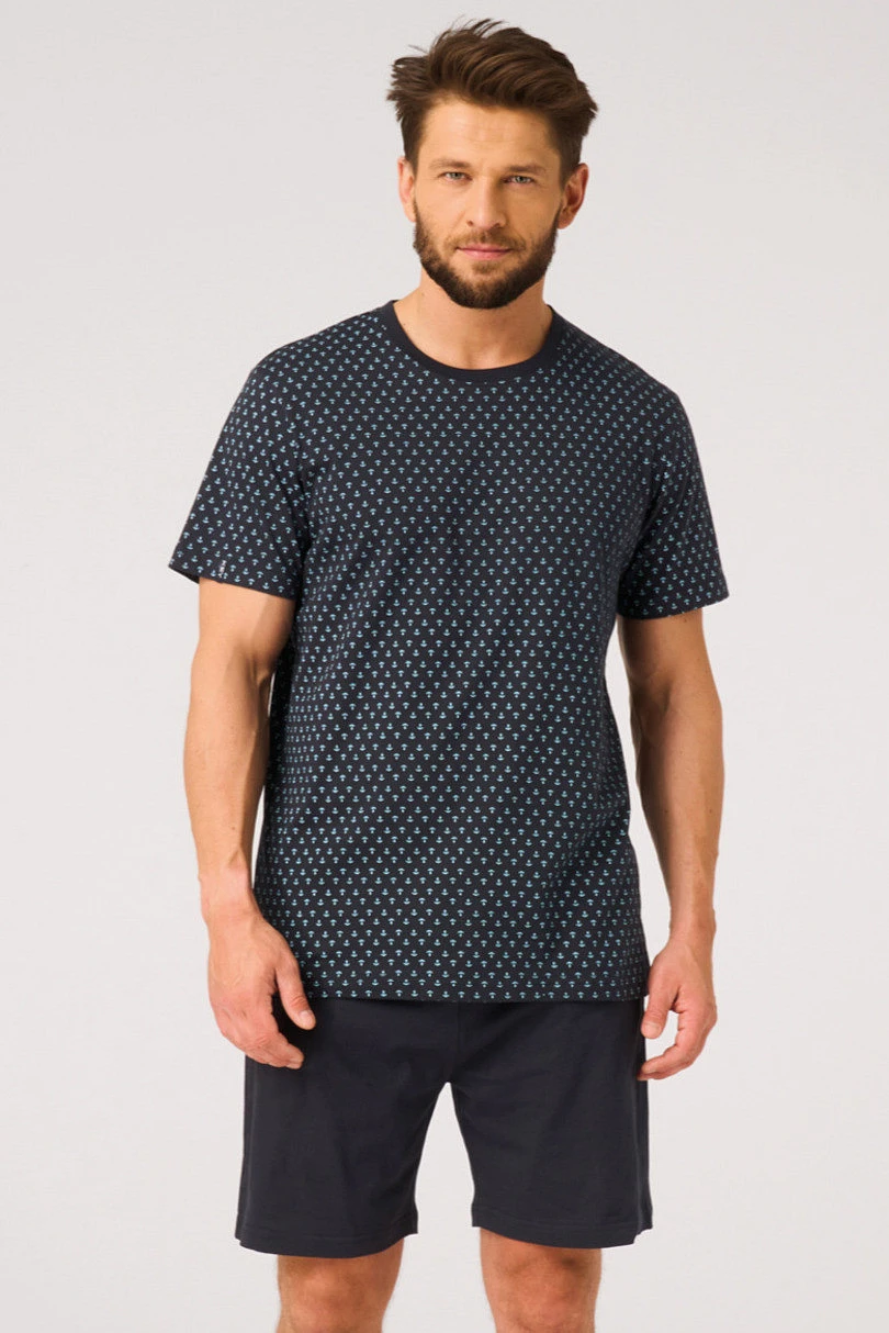 Pánska pyžamová súprava je dokonalou kombináciou pohodlia a klasického štýlu. Súprava pozostáva z trička s krátkymi rukávmi a krátkych šortiek v jednoduchom, voľnom strihu. Vysokokvalitná, mäkká pletenina je príjemná na pokožku a poskytuje pohodlie počas celej noci a pri domácom odpočinku.