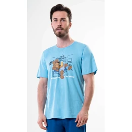 Pánske bavlnené pyžamo Boss shorts. Pánske pyžamo pozostáva z trička s krátkymi rukávmi a krátkych šortiek. Jednofarebné tričko s okrúhlym výstrihom obsahuje obrázok medveďa odpočívajúceho v kresle a nápis "Im the Boss of my House". Tričko dopĺňajú jednofarebné šortky, ktoré majú elastický pás a šnúrku na stiahnutie. Nemajú žiadne vrecká. Použitý materiál je príjemný a pružný na dotyk. Obsah bavlny v tričku a šortkách je 100 %. Pyžamo je vhodné na každodenné nosenie.