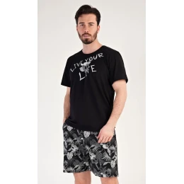 Pánske bavlnené pyžamové šortky Ži svoj život. Pánske pyžamo pozostáva z trička s krátkym rukávom a krátkych šortiek. Na jednofarebnom tričku je lebka a nápis "Live your life". Tričko dopĺňajú šortky s potlačou lebiek. Šortky majú elastický pás, šnúrku na stiahnutie a praktické vrecká. Použitý materiál je príjemný a pružný na dotyk. Pyžamo je vhodné aj na každodenné nosenie.