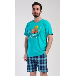 Pánske bavlnené šortkové pyžamo Adventure. Pánske pyžamo sa skladá z trička s krátkym rukávom a krátkych šortiek. Na tričku je obrázok karavanu a nápis "Good days bring big waves" (Dobré dni prinášajú veľké vlny). Tričko dopĺňajú kárované šortky, ktoré majú elastický pás, šnúrku na stiahnutie a praktické vrecká. Použitý materiál zo 100 % bavlny je príjemný a pružný na dotyk.