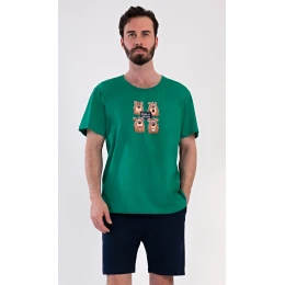 Pánske bavlnené šortkové pyžamo Bear Happy. Pánske pyžamo sa skladá z trička s krátkym rukávom a krátkych šortiek. Na jednofarebnom tričku je obrázok medveďa, ktorého výraz sa počas (pracovného) dňa mení. Šortky majú praktické vrecká, elastický pás a šnúrku na stiahnutie. 100 % bavlnený materiál je príjemný a mäkký na dotyk. Pyžamo je vhodné na každodenné nosenie a oceníte ho najmä počas horúcich letných dní.