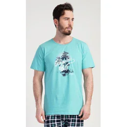 Pánske bavlnené pyžamové šortky Honolua bay. Pánske pyžamo sa skladá z trička s krátkymi rukávmi a krátkych šortiek. Na tričku je obrázok malého ostrova a nápis "Honolua bay". Tričko dopĺňajú kárované šortky, ktoré majú elastický pás a šnúrku na stiahnutie, ale nemajú vrecká. Použitý materiál zo 100 % bavlny je príjemný a pružný na dotyk.