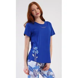 Dámske bavlnené capri pyžamo Julie. Pyžamo sa skladá z trička s krátkym rukávom a trojštvrťových nohavíc. Tričko s okrúhlym výstrihom je v spodnej časti zdobené obrázkom kvetov. Nohavice s potlačou listov majú elastický pás a šnúrku na stiahnutie a sú bez vreciek. Použitý bavlnený materiál je príjemný a pružný na dotyk.