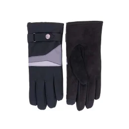Elegantné pánske rukavice z príjemného materiálu. Ideálne na zimu. Vrchná časť je vyrobená z hladkého materiálu, spodná časť je semišová. Rukavice sú zdobené pruhmi materiálu v kontrastnej farbe. Na manžete je navyše ozdobné tlačidlo. Na vnútornej strane je horná časť rukavice dvojvrstvová. Na špičkách oboch ukazovákov je našitý materiál, ktorý umožňuje používať dotykové obrazovky.