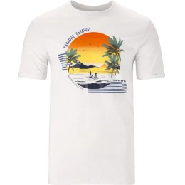 Dominantným prvkom je farebná potlač na hrudi s motívom západu slnka , paliem a paddleboardistov, ktorú dopĺňajú texty "PARADISE GETAWAY", "PEACEFUL LIFESTYLE" a "TRAVEL BY SEA". Tento dizajn navodzuje atmosféru pokoja, dobrodružstva a letného oddychu .