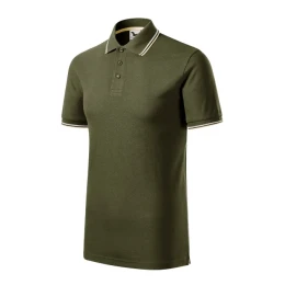 strih s bočnými švami golier z rebrového úpletu 1:1 2 kontrastné pruhy na rukáve a manžete goliera s 3 gombíkmi vo farbe materiálu spodný gombík prišitý kontrastnou niťou vnútorný výstrih utesnený kontrastnou páskou ramenné švy spevnené páskou rozparky v bočných švoch s kontrastnou páskou