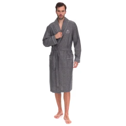 Štýlový a pohodlný pánsky župan 2532 je ideálnou voľbou pre mužov, ktorí oceňujú eleganciu a pohodlie. Je vyrobený zo 100 % mäkkej, priedušnej bavlny a poskytuje príjemné teplo a úplné pohodlie. Klasický strih so šálovým golierom a jemným lemovaním mu dodáva nadčasový charakter. Župan v tlmenej sivej far be je ideálny na chladné rána a večery, po kúpeli alebo pri relaxácii doma. Ideálny darček pre muža, ktorý oceňuje štýl a kvalitu.