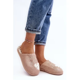 Lesklé dámske papuče zdobené nápisom a srdiečkom. Nasadzovací model so zakrytým nosom. Stojí na hrubej podrážke. Stielka podšitá kožušinou.