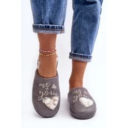 Lesklé dámske papuče zdobené nápisom a srdiečkom. Nasadzovací model so zakrytým nosom. Stojí na hrubej podrážke. Stielka podšitá kožušinou.