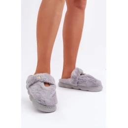 Kožené dámske papuče. Model zdobený jemnou, malou brošňou, ktorá dodáva eleganciu. Zadný stabilizačný pás nielen zvyšuje pohodlie nosenia, ale tiež zabezpečí lepšie prispôsobenie šľapiek k nohe. Roztomilé a funkčné, skvelé ako súčasť domácej relaxácie, ktorá spája štýl s praktickosťou.