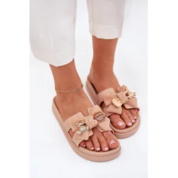 Dámske sandále s výrezmi, osadené na jemnej platforme. Vyrobené z gumového materiálu. Zdobené mašľou a zlatou brošňou dodajú štýlový akcent každému outfitu. Ideálne na teplé dni, perfektne sa hodia k letným šatám, sukniam a šortkám.