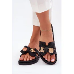 Dámske sandále s výrezmi, osadené na jemnej platforme. Vyrobené z gumového materiálu. Zdobené mašľou a zlatou brošňou dodajú štýlový akcent každému outfitu. Ideálne na teplé dni, perfektne sa hodia k letným šatám, sukniam a šortkám.