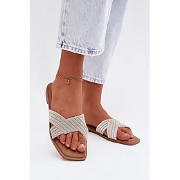 Dámske ploché papuče sú štýlovou ponukou na teplé dni. Remienok zdobený kamienkami priťahuje pozornosť a dodáva celku jemný lesk. Jednoduchý strih zaručuje pohodlie pri nosení, takže papuče sú ideálne na každodenné aj elegantnejšie letné outfity.