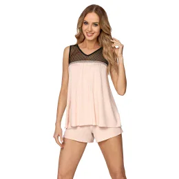 Štýlové dvojdielne pyžamo s nápadným priesvitným tylom na ramenách. Bodkovaný tyl, čierny, sexy. Pyžamo je vyrobené z mäkkej, pružnej tkaniny. Blúzka so širšími ramienkami, komplet s pohodlnými krátkymi šortkami na gumu. Zloženie: 94% viskóza, 6% elastan.