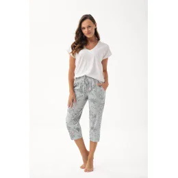 Mladé dámske pyžamo značky Luna, 3/4 dlhé nohavice s potlačou, v páse zdobené šnúrkami, vrecká. Jednofarebné, lodičkový výstrih, krátke rukávy.