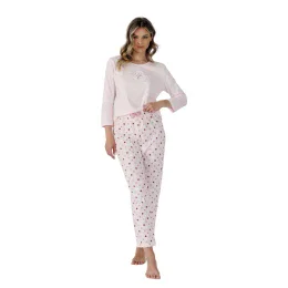 Dámske pyžamo s rukávmi v dĺžke 7/8, okrúhlym výstrihom, farebnou potlačou na prednej strane. Vzorované nohavice v dĺžke 7/8. Ozdobná mašľa v páse.