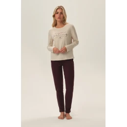 Piżama damska wykonana z delikatnej bawełny. Koszulka z długim rękawem, spodnie długie, wzorzyste. Dekolt okrągły.