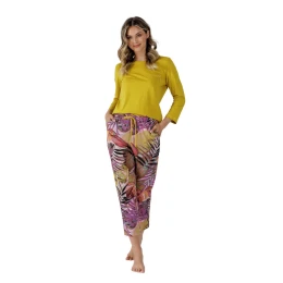 Dámske pyžamo so 7/8 rukávmi z jemnej bavlny, výstrihom, vreckom na hrudi a vzorovanými 7/8 nohavicami.