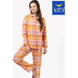 Dámske pyžamo z károvaného bavlneného flanelu zdobeného trblietavou niťou. Blúzka s dlhými rukávmi a otvoreným golierom, dlhé nohavice s vreckami, pohodlný elastický pás. Teplý a na dotyk úžasne príjemný flanelový materiál ideálny na chladné zimné večery.