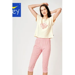 Dámske bavlnené pyžamo. Sieťované nohavice s jemnou potlačou, jednofarebné tričko s krátkym rukávom a motívom na prednej strane.