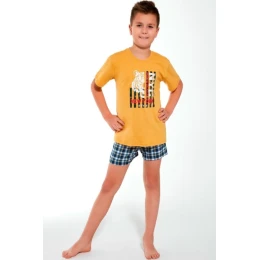 Chlapčenské bavlnené pyžamo, tričko s krátkym rukávom s potlačou, kárované šortky, pyžamo zabalené do zavinovačky.