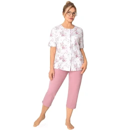 Blúza pyžamá má krátke rukávy a je ozdobená kvetinovým vzorom. Pologuľatý výstrih sa zapína gombíkmi. Hladké nohavice majú 3/4 dĺžku. Strih a vzhľad pyžamá zachytávajú prvé štyri fotografie.