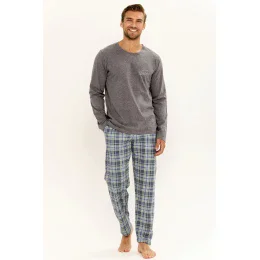 Pánske jednofarebné pyžamo s dlhými rukávmi, vpredu zdobené jemnou potlačou, okrúhlym výstrihom Plus dlhé kockované nohavice s rovnými nohavicami.