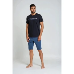 Pohodlné dvojdielne pyžamo z novej kolekcie Henderson v skvelom farebnom prevedení. Čierny, pohodlný vrchný diel trička s potlačou. Grafitové nohavice po kolená s módnou potlačou a elastickým pásom. Skvelý, športový vzhľad, vďaka ktorému sa každý muž bude cítiť pohodlne a uvoľnene.