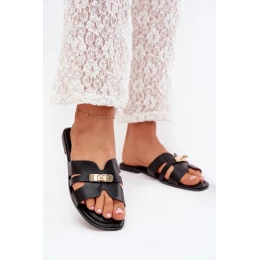 Płaskie Klapki Damskie Z Paseczkiem I Złotym Detalem Czarne Kerenza