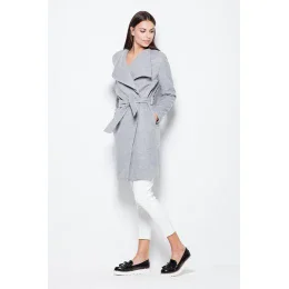 Elegantný kabát, zaväzovaný v páse s pôsobivým rozšíreným golierom. Model klasického strihu.