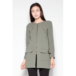 Rovno strihaný kabát na zips s ozdobnými vreckami a nápadným rázporkom na zipse. Ozdobné zipsy na manžetách a golieri. Skvele sa hodí na každodenný styling.