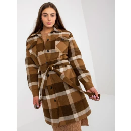 Hnedý dámsky kockovaný kabát so zapínaním na gombíky.