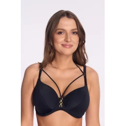 Konštrukcia s kosticami a nastaviteľné ramienka poskytujú ideálnu oporu aj pre väčšie poprsie. Tenké ozdobné ramienka nad košíčkami vytvárajú geometrickú kompozíciu, ktorá krásne zvýrazňuje dekolt a dodáva modelu moderný, mierne dravý nádych. Zlaté detaily dodávajú modelu luxusný vzhľad a pevné zapínanie zaisťuje stabilitu aj počas vodných aktivít.