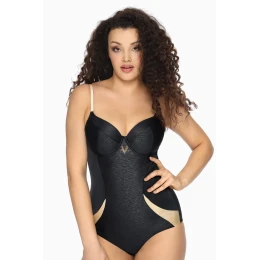 Kombinácia dvoch typov čierneho úpletu - hladkého a štruktúrovaného so zlatými vsadkami a ramienkami - je elegancia sama o sebe. Plné košíčky zbierajú a nadvihujú prsia, čím ich dokonale tvarujú, zatiaľ čo usporiadanie látok opticky zoštíhľuje celú siluetu a účinne zakrýva nedokonalosti postavy. Na tomto pozadí sa logo AVA trbliece ako odznak superhrdinky - cíťte sa ako Wonder Woman!
