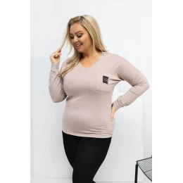 Blůza ve velikosti plus s klasickým každodenním charakterem je skvělou základnou pro mnoho stylizací. Hladký vzor jí dodává univerzálnost, díky čemuž ji lze snadno sladit jak s džíny, tak s látkovými kalhotami nebo legíny. Standardní délka zajišťuje, že blůza dobře padne na postavu a poskytuje pohodlí po celý den. Model je vyroben z velmi měkkého mikro modálu s přídavkem elastanu, který je příjemný na dotek, prodyšný a elastický. Dlouhý rukáv a výstřih ve tvaru V jemně zdůrazňují krk a dekolt, dodávají celku lehkost. Blůza nemá zapínání, což zvyšuje pohodlí při nošení. Stylovým akcentem je kapsička na hrudi zdobená dekorativní nášivkou, která prolamuje jednoduchý tvar a dodává blůze moderní charakter.