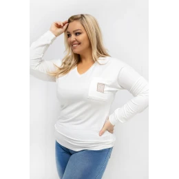 Halénka ve velikosti plus s klasickým, každodenním charakterem je skvělý základ pro mnoho stylizací. Hladký vzor jí dodává univerzálnost, díky čemuž ji lze snadno sladit jak s džíny, tak s látkovými kalhotami nebo legíny. Standardní délka zajistí, že halenka se dobře přizpůsobí postavě a poskytne pohodlí po celý den. Model je vyroben z mimořádně měkkého mikromodálu s přídavkem elastanu, který je příjemný na dotek, prodyšný a elastický. Dlouhý rukáv a výstřih do V decentně zdůrazňují krk a dekolt, dodávají lehkost celkovému vzhledu. Halenka nemá zapínání, což zvyšuje pohodlí při nošení. Stylovým akcentem je kapsa na hrudi zdobená dekorativní nášivkou, která prolamuje jednoduchý tvar a dodává halence moderní charakter.