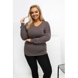 Blůza ve velikosti plus s klasickým, každodenním charakterem je skvělou základnou pro mnoho stylizací. Hladký vzor jí dodává univerzálnost, díky čemuž ji lze snadno sladit jak s džíny, tak i s látkovými kalhotami nebo legíny. Standardní délka zajišťuje, že blůza dobře padne na postavě a poskytuje pohodlí po celý den. Model je vyroben z velmi měkkého micro modalu s přídavkem elastanu, který je příjemný na dotek, prodyšný a elastický. Dlouhý rukáv a výstřih do V decentně zdůrazňují krk a dekolt, dodávají celku lehkost. Blůza nemá zapínání, což zvyšuje pohodlí při nošení. Stylovým detailem je kapsa na hrudi zdobená dekorativní nášivkou, která prolomuje jednoduchý tvar a dodává blůze moderní charakter.