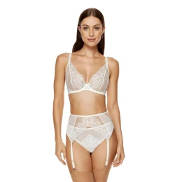 Krémový podväzkový pás ideálny na svadobnú hostinu. Elegantná trblietavá výšivka na prednej strane pásu. Trojradové zapínanie na háčiky a slučky a pohodlné, nastaviteľné popruhy s háčikmi a pútkami na pripevnenie pančúch. Pás je navrhnutý a ušitý v Poľsku.
