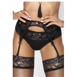 Sexi podväzkový pás Hannah, vyrobený z krásnej kvetinovej čipky, zdobený jemnými stuhami a mašľami na zadnej strane.