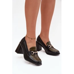Półbuty Damskie Na Słupku Z Tłoczeniem I Złotym Detalem Zielono-Czarne Novella