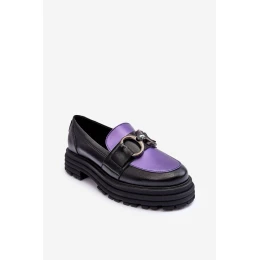 Półbuty Loafersy Damskie Skórzane Na Płaskim Obcasie Czarno-Fioletowe Elkiza